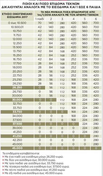 1. Οικογένειες με ένα παιδί και εισόδημα μέχρι 250 ευρώ δικαιούνται 70, 42 και 28 ευρώ το μήνα. Με το προηγούμενο καθεστώς έπαιρναν επίδομα για εισόδημα έως 27.000 ευρώ που ήταν 40, 27 και 13 ευρώ το μήνα.